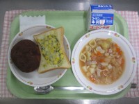 しおバタートースト シナモンシュガートースト クリームシチュー オニオンドレッシングサラダ ぎゅうにゅう