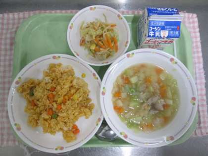 メキシカンピラフ、サウピカンサラダ、レンズまめのスープ、ぎゅうにゅう