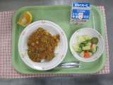 キーマカレー ポテトのドレッシングあえ くだもの ぎゅうにゅう