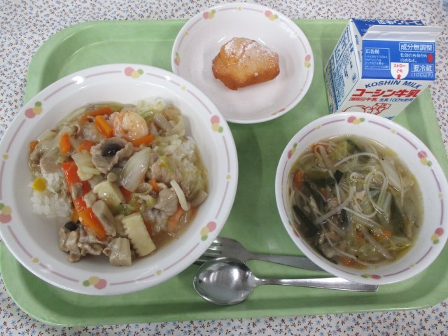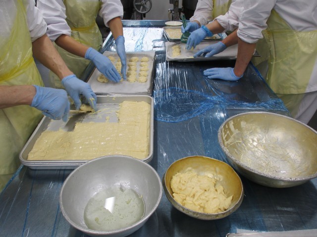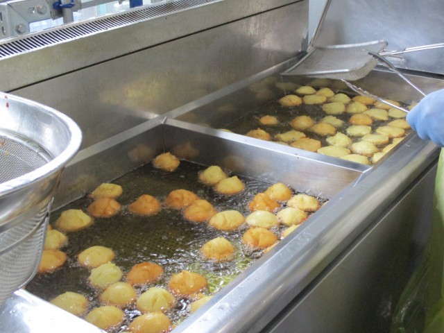 今日のドーナツは豆腐を使っています。調理員さんたちが1つ1つ生地を丸めて、フライヤーという機械で揚げて作ってくれました。