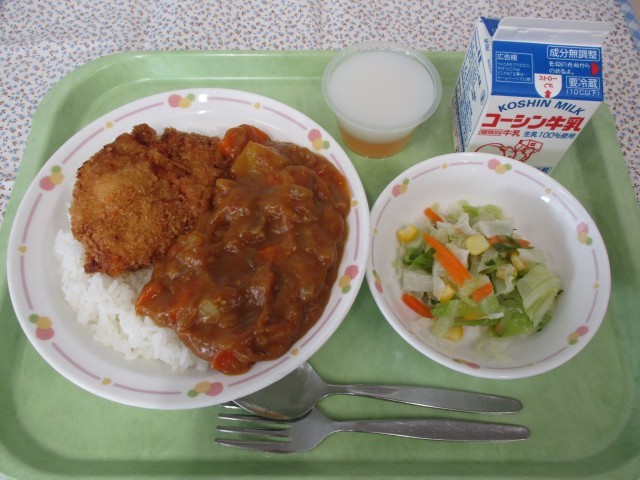 今日の給食は、運動会に向けて頑張る皆さんを応援するメニューです。今日のカレーライスには豚カツが乗っています。豚肉は、体の疲れをとる働きがあるビタミンB1や、体の筋肉をつくるたんぱく質が多く含まれています。カツは、勝利に「勝つ」という意味を込めました。