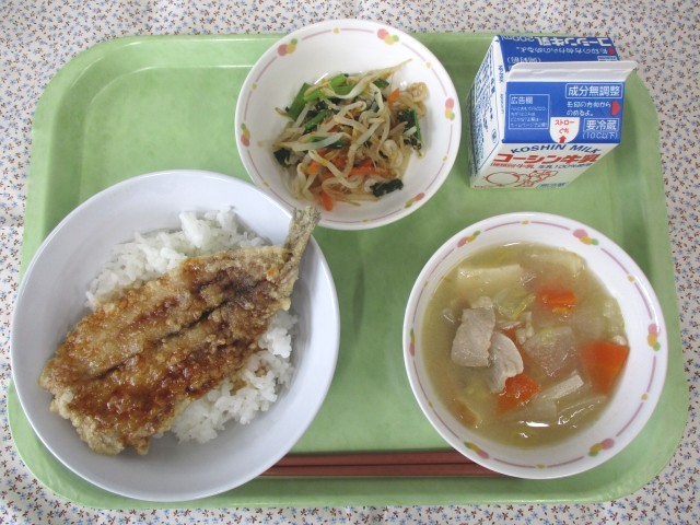 今日のかば揚げ丼に使用している魚は鰯です。鰯は縄文時代から食料として食べられていたと言われています。また、鰯には頭の働きをよくするEPAという成分が多く含まれています。