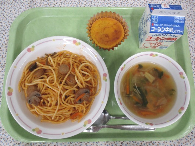 今日10月31日は、ハロウィンです。ハロウィンの日には、魔女やおばけの仮装をしたり、近くの家を訪ねてお菓子をもらったりしますね。しかし、ハロウィンは、もともと秋の収穫をお祝いし、悪いおばけを追い出す行事です。今日はハロウィンにちなんだ給食でした。
