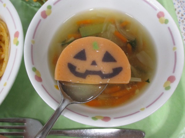 かぼちゃをくり抜いて作るおばけかぼちゃを「ジャック・オー・ランタン」といいます。今日のスープには、ジャック・オー・ランタンの形をしたかまぼこを入れました。子どもからは「可愛い」といった反応がたくさん見られました。