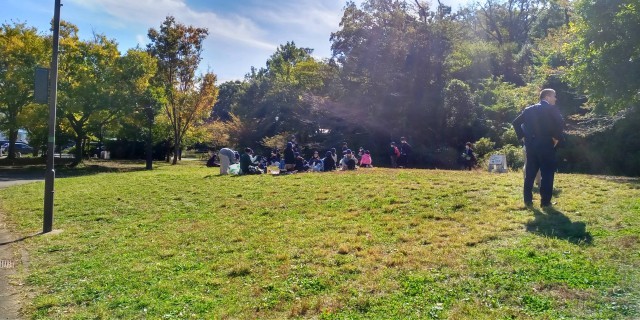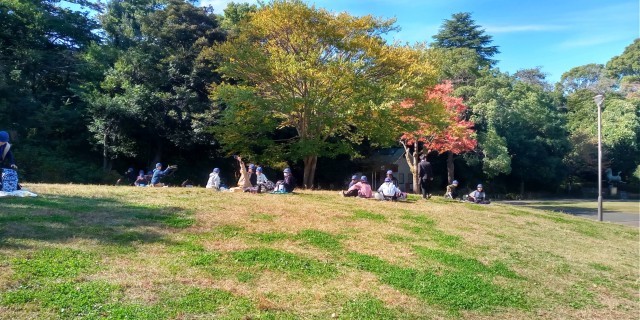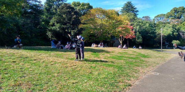 秋晴れの空の下、赤や黄色に染まった木々の葉がとても美しく、すてきな公園です。