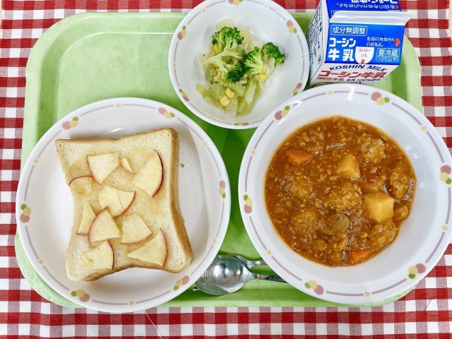 アップルハニートーストに使われているりんごは、秋に美味しい時期を迎える食べ物です。皮付きのりんごを薄く切ったものに、はちみつ、マーガリン、シナモンなどを混ぜたものをパンに塗って焼きました。