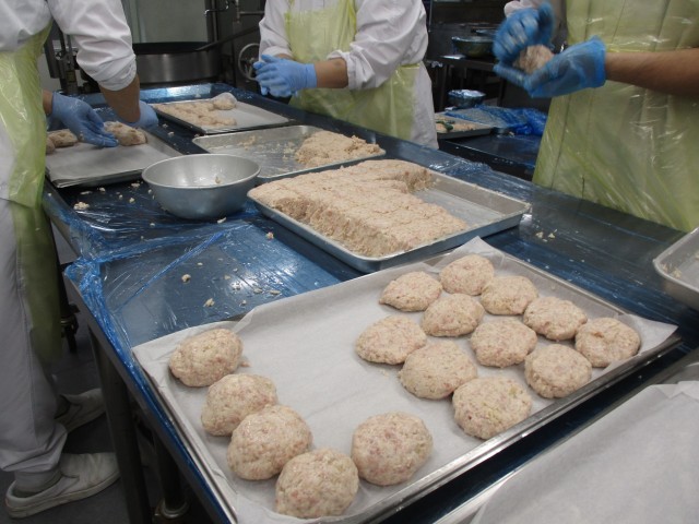 ハンバーグと言えば、ひき肉と玉ねぎが主な材料ですが、今日は豆腐も入っています。豆腐が入ることで、歯や骨を丈夫にする栄養素「カルシウム」をたくさんとることができます。豆腐は大豆から作られていて、体をつくるたんぱく質もたくさん含まれています。ハンバーグは調理員さんたちが1つ1つ成形し、ソースはケチャップ、デミグラスソース、中濃ソース、出汁で作っています。今日は「ご飯が進む~」と言いながら食べている様子も見られました。