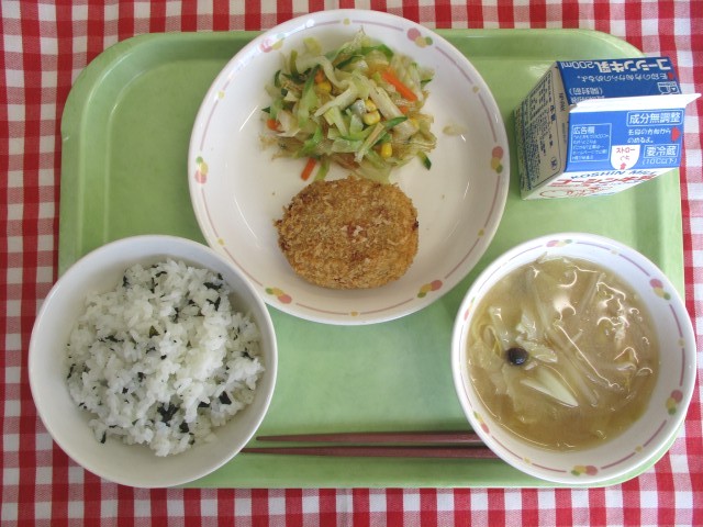 肉じゃがコロッケは、にんじん、玉ねぎ、豚肉、しらたきなど肉じゃがの具材が入ったコロッケです。味がしっかりついているので、ソースをかけなくても美味しく食べられます。今日は肉じゃがコロッケが好評でした。