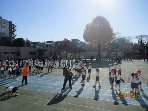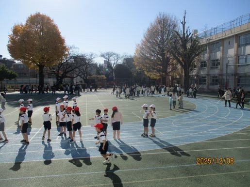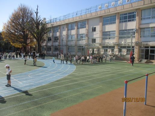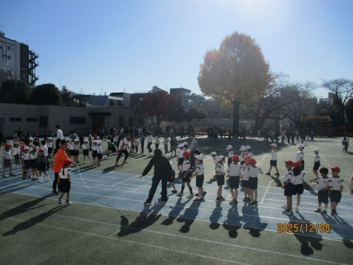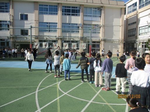 20分休み、全校児童が校庭に出て、温かい日差し手の下で長縄跳びの練習が始まりました。