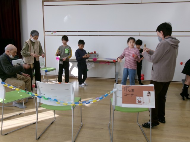 交流の時間には、昔の遊びなどをして一緒に遊びました。子供たちは、高齢者の方々とのつながりをより身近に感じた様子でした。
