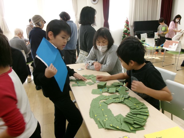 はじめに、子供たちが元気いっぱいのあいさつとすると、高齢者の方々からは温かい拍手をいただき、会場が和やかな雰囲気に包まれました。その後は、ラジオ体操を一緒に行い、世代をこえて体を動かしました。「からだがぽかぽかしてきたよ」「みんなといっしょに動くと楽しいね」と、笑顔がたくさん見られました。