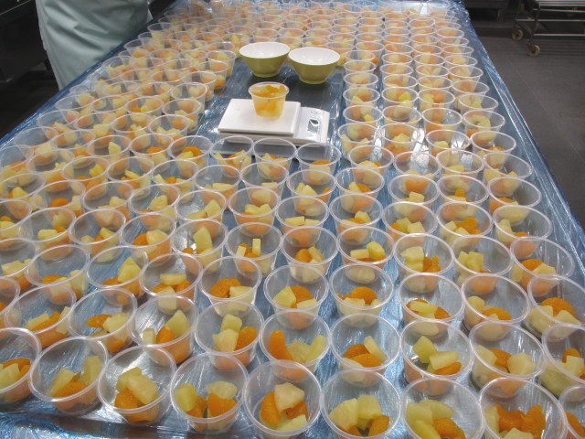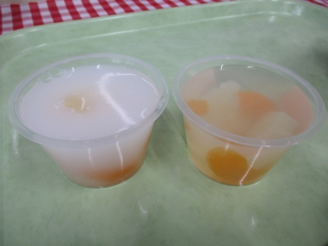 今日はリザーブ給食です。「リザーブ(reserve)」とは、英語で予約をするという意味があります。今回のリザーブ給食は、2種類のゼリーから1つ選ぶことができました。全体の結果はサイダーゼリーを選んだ人が261人、カルピスゼリーを選んだ人が169人でした。どちらのゼリーにもパインとみかんが入っています。