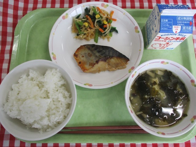 今日の香味焼きには鯖を使用しています。鯖には、DHAやEPAという栄養が入っています。これらの栄養には、頭の働きをよくする効果があると言われています。今日はねぎ、にんにく、生姜といった香味野菜と調味料を合わせたものに、鯖を漬け込んでオーブンで焼きました。