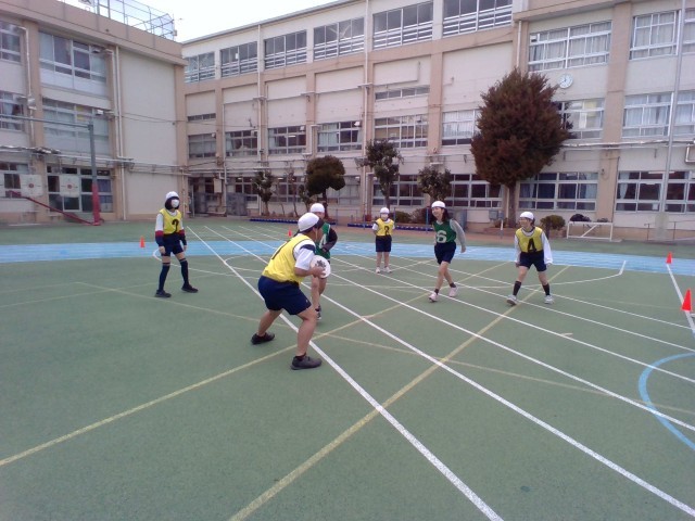 体育科のゴール型ゲームでアルティメット(フライングディスク)を行いました。最初はキャッチに難しさを感じながらも、段々と上達して、近距離から遠距離のパス交換をできるようになりました。学習の最後にはチームごとに分かれてゲームを行うことができました。フライングディスクを落とさないように、自分たちで声を掛け合ってゲームを進めていく姿が、さすが高学年でした。これからの体育の学習に向けて貴重な体験となりました。