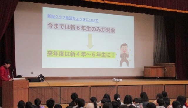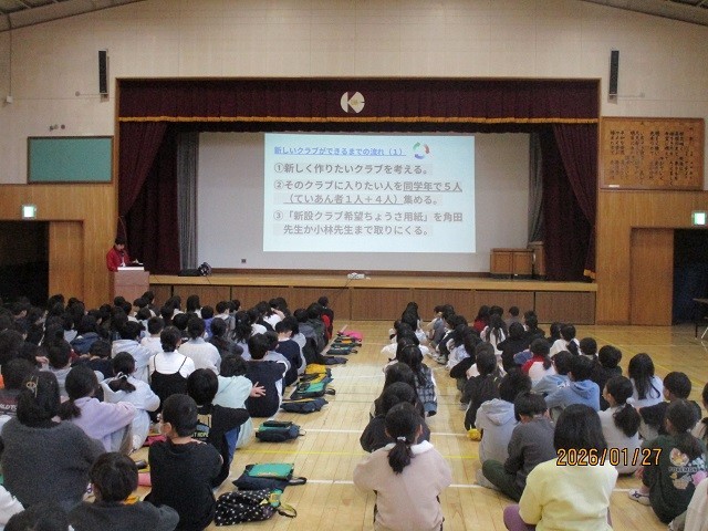 1月27日(火)朝の時間に、3~5年生向けに、来年度の新しいクラブの設立についてオリエンテーションが行われました。今までは5年生が対象でしたが、今年度はみんなのクラブをみんなで考えよう!ということで対象学年3~5年生で考えます。どのようにしたらそのクラブが設立できるのか、提案するときの注意点や今後の流れについて説明を受けました。新4~新6年生すべての学年が協力して行えるクラブが設立されることを楽しみにしています。