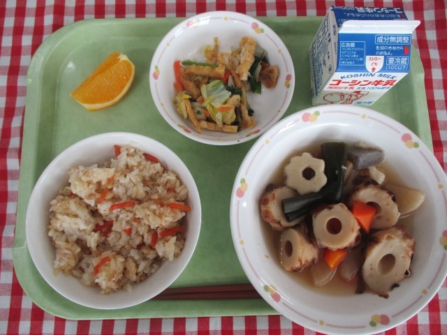 昨日の2月1日は、初午の日でした。初午は「お米や野菜がたくさんとれますように」と願って稲荷神社にお参りをする日とされています。その神社の神様のお使いがきつねとされていることから、きつねが好きな油揚げなどをお供えする風習があります。今日は、こぎつねご飯の中に醤油と砂糖で煮た油揚げが入っています。