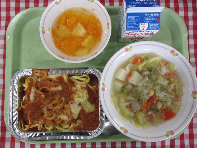 ラザニアは、板状のパスタとミートソースを重ねてオーブンで焼いたイタリアの家庭料理です。学校では、生の平打ちスパゲッティをゆで、ミートソース、チーズをのせて焼きました。ラザニアは、とても手間のかかるメニューですが、給食室の調理員さんが1つ1つ丁寧に作ってくださいました。