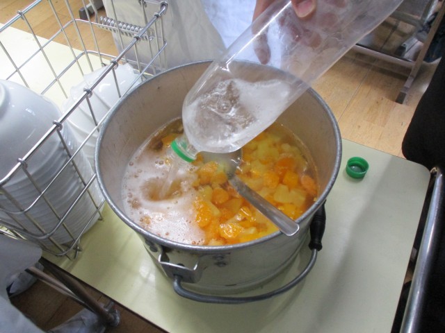 今日のフルーツポンチにはサイダーが入っています。教室でペットボトルを開けて食缶に注ぐスタイルで提供し、子どもたちも喜んでいました。