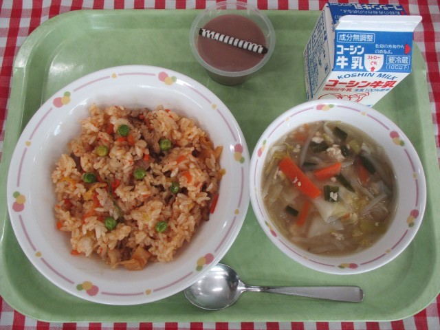 今日の給食は、全て6年生からのリクエストメニューです。キムチは白菜や大根を塩に漬けて、さらに魚介やとうがらし、にんにくなどを混ぜ込んで、乳酸菌で発酵させたものです。乳酸菌はおなかの中をきれいにしてくれる働きがあります。また、キムチの辛さは体を温めてくれます。ビタミンもたくさんふくまれている食品なので、風邪予防にもなる食品です。