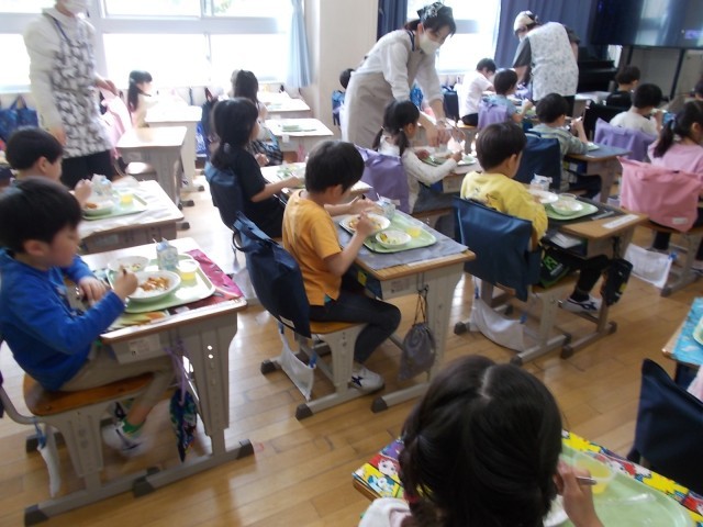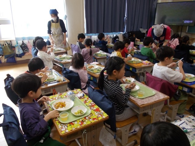 いただきますの後5分間は、もぐもぐタイム。「なんかこのパプリカ、違う。おいしいよ。」「ぼく、キュウリは苦手なんだ。」「このゼリー、学校で作ったの?」といった声も聞かれ、楽しい給食の時間となりました。