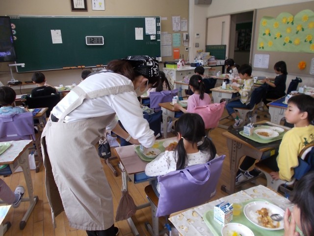 給食の時間には、担任以外の教員や補助員も教室に入り、子供たちの様子を見守りながら支援しています。