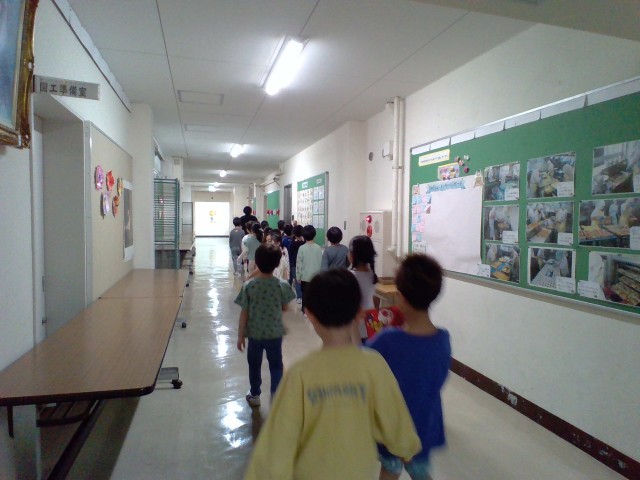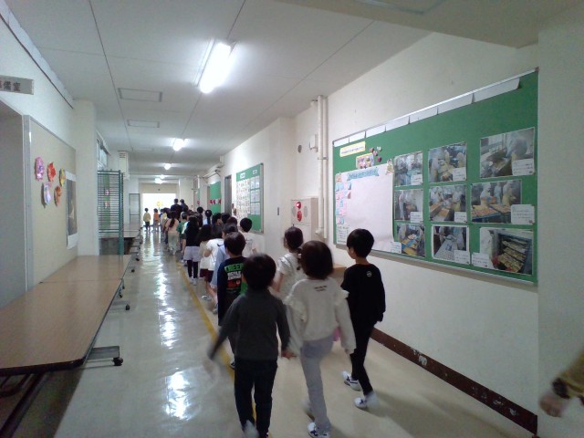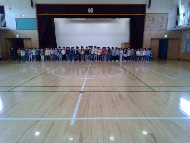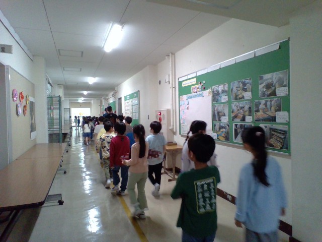 1年生が廊下に並び、お話もせず静かに歩いていました。どこへ行くのかなと思って見ていると、向かった先は体育館でした。明日の朝、体育館で行う「対面式」の練習のためです。