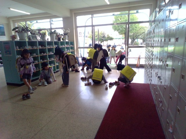 学童の子どもたちが靴を履き、その後は青コース、緑コース、赤コースと順に下校していきます。