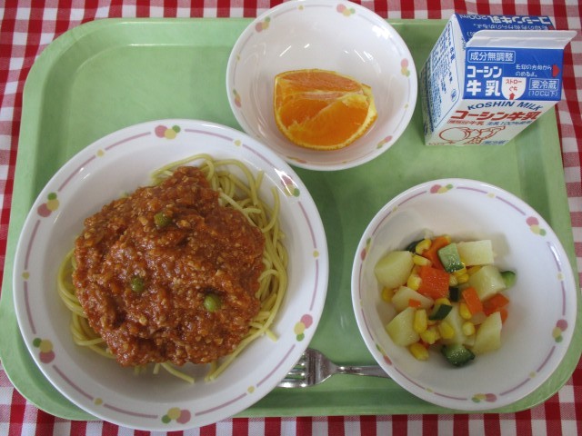 スパゲッティには、ミートソースやカルボナーラ、たらこなどたくさんのソースがあります。スパゲッティだけだと、野菜がなかなかとれない場合があるので、今日の献立のようにサラダなどを一緒に食べるとバランスの良い食事になります。