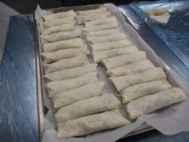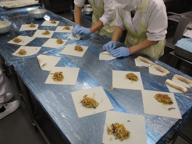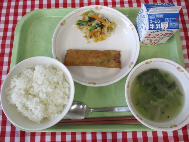 春巻きは、中国で生まれた料理です。春に新芽を出した野菜を使って具を作り、皮で巻いたことから、「春巻き」と呼ばれるようになりました。今日の春巻きには、今が旬のたけのこ、にんじんなどたくさんの野菜が入っています。給食室では、朝早くから春巻き作りが始まりました。全校で約450個もの春巻きを1つ1つ皮に包み、油で揚げて作りました。