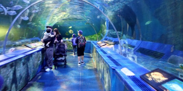 水中餌付けタイムにも、ちょうどぶつかり、ダイバーから餌をもらう魚たちを水中トンネル水槽から、見ることができました。