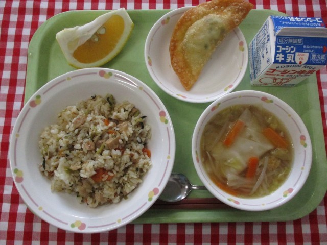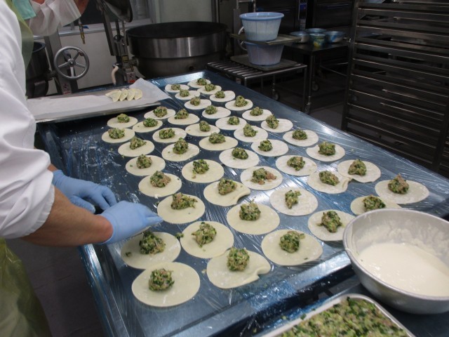 今日の餃子は、調理員さんたちが餃子のタネを一つ一つ丁寧に皮に包み、油で揚げて作りました。