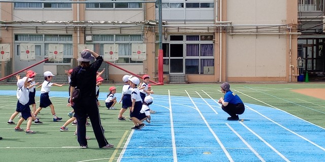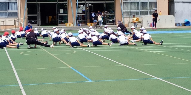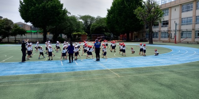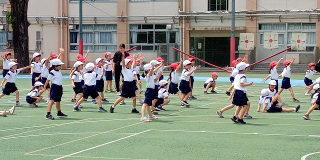 1年生の体育では、準備運動をした後、「体全体でじゃんけんポン」を楽しみました。グーやチョキ、パーを全身で表現しながら、先生や友達と元気いっぱいじゃんけんです。「やったー!」という楽しそうな声や笑い声が校庭に響いていました。どんなポーズがグー、チョキ、パーだったのか、ぜひお子さんに聞いてみてください。