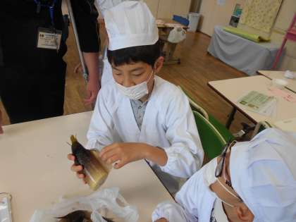 それを使ってたけのこの味噌汁を作りました。たけのこのぬるぬるした感触に驚いている児童もいましたが、協力して皮むきや包丁で切る作業を行いました。