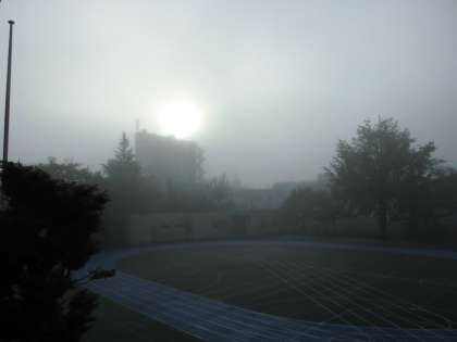 朝、学校に着くとびっくりの霧!!