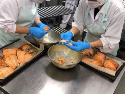 右側の写真は、調理員さんが手作業で鮭の身をほぐしている様子です。