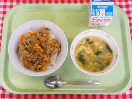プルコギは、韓国風のすき焼きです。『プル』とは、韓国語で“火”、『コギ』は”肉”という意味があります。今日は、「コチュジャン」という韓国の辛いみそで味付けしました。韓国では、牛肉を使いますが、給食では豚肉を使っています。