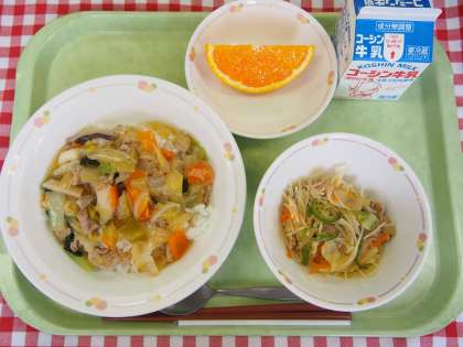今日の「中華丼」には、野菜や魚介類がたっぷり入っています。