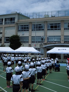 閉会式には、6年生と1年生が参加し、他の学年は、教室で参加しました。6年生が終わりの言葉を述べ、国旗を降納しました。PTAからは、記念品のノートをいただきました。