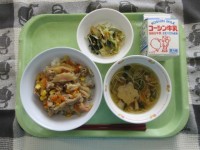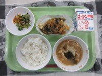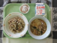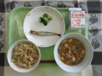 しめじと舞茸のご飯冬瓜入り豚汁ししゃものカレー焼きあっさりきゅうり牛乳