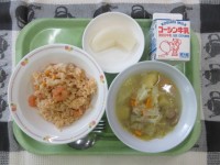 サーモンピラフガリシア風スープチキンケバブ牛乳