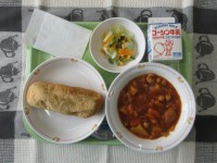 きな粉揚げパンポークビーンズシチューレモンドレッシングサラダ牛乳