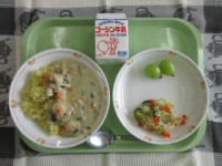 エビクリームライスイタリアンサラダシャインマスカット牛乳今日のデザートは梨の予定...