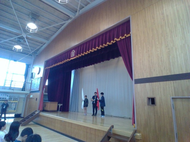 運動会前日ということもあり、全校朝会では応援団長が登壇し、各団を代表して意気込みを語りました。