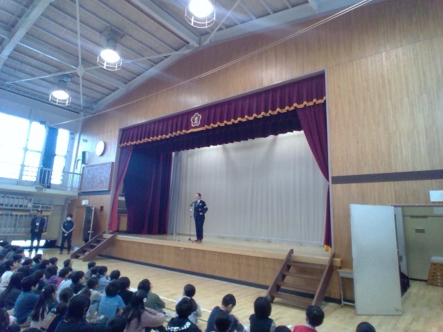 本日は、目白警察署の方に来ていただき、交通安全についてお話をしていただきました。学校の外に一歩出ると、車や自転車が行き交っています。常に注意をしていないと、事故につながる危険があります。交通事故は命に関わる大変怖いものです。自分の命は自分で守ることが大切です。飛び出しをしない、道路でふざけない、横断歩道では左右をしっかり確認するなど、基本的なことを改めて意識しましょう。