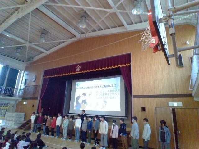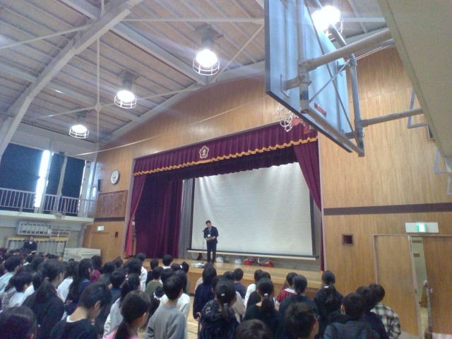 明日からは冬休みです。生活指導主任の先生からは、パソコンクラブが作成したスライドを使って、冬休みの過ごし方についてお話がありました。