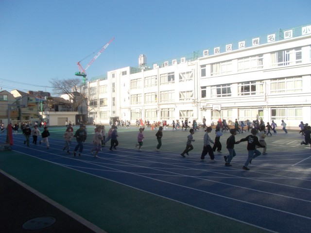 校舎に囲まれた朝の校庭は、日陰がとても多く、寒く感じられますが、時間までに集合し、やる気いっぱいです。