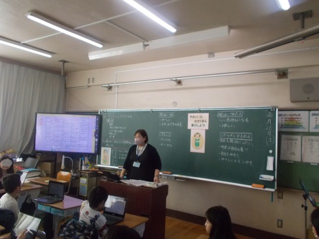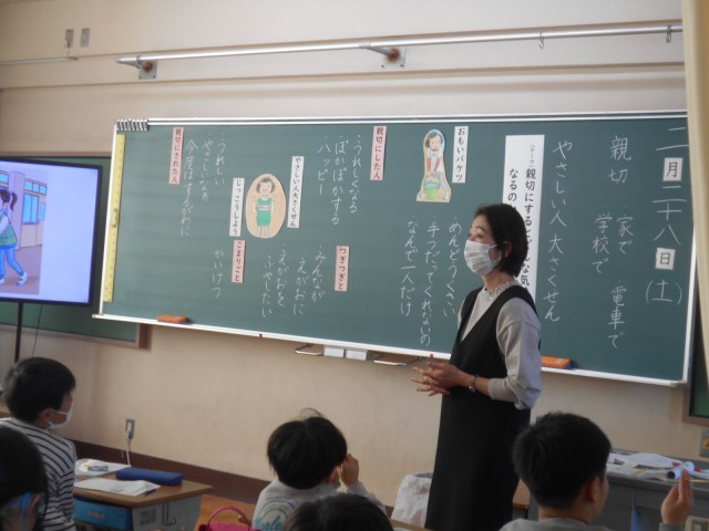 「やさしい人大さくせん」という教材をもとに、親切、思いやりについて考えました。