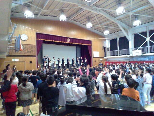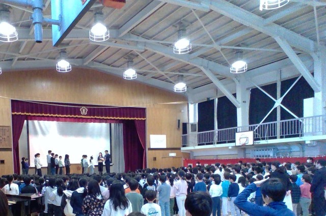 続いて行われた離任式では、椎名町小学校を去られる先生方をお見送りしました。先生方からの「応援しています。」という言葉に、子どもたちは真剣な表情で耳を傾け、感謝の気持ちを込めて大きな拍手で送り出しました。中には名残を惜しむ様子も見られ、温かい雰囲気の中での式となりました。