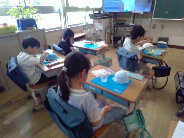 今週は、図工でオリジナルケーキづくりをしました。紙粘土に絵の具を混ぜて、カップ麺の容器に貼っていきました。紙粘土の触り心地に喜んだりびっくりしたりしながら、楽しんで取り組みました。来週は、飾り付けをします。カップ麺の容器のご用意にご協力いただきありがとうございました。