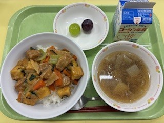 そしてくだものは、ぶどうでした。今日はシャインマスカットとピオーネの2種類を出して、食べ比べをしてもらいました。